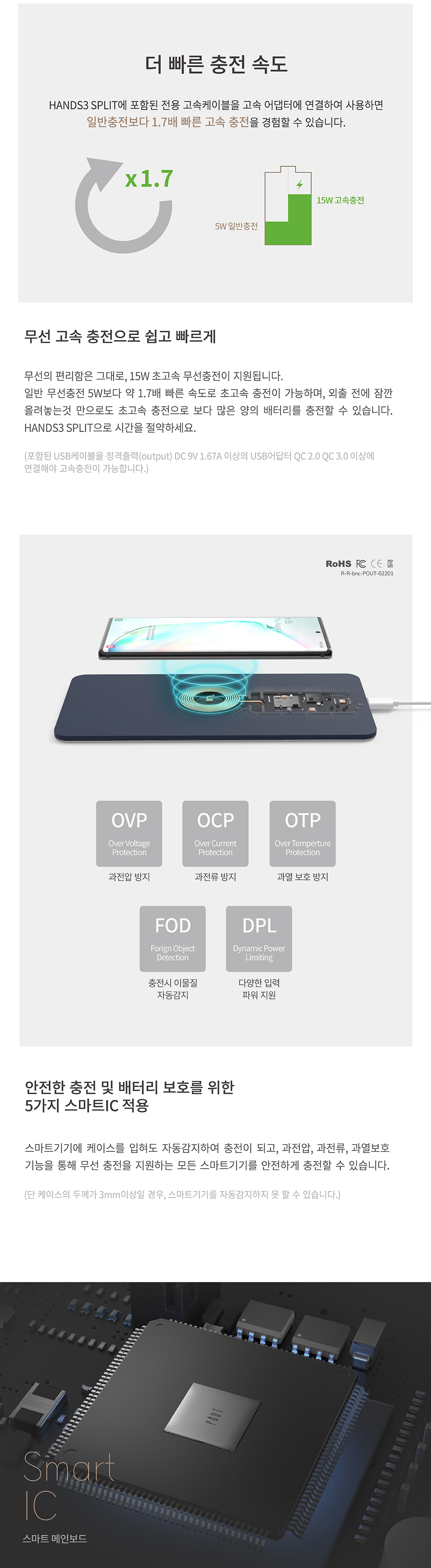 5가지 스마트IC : 과전압 방지, 과전류 방지, 과열보호 방지,충전시 이물질 자동감지,다양한 입력 파워지원