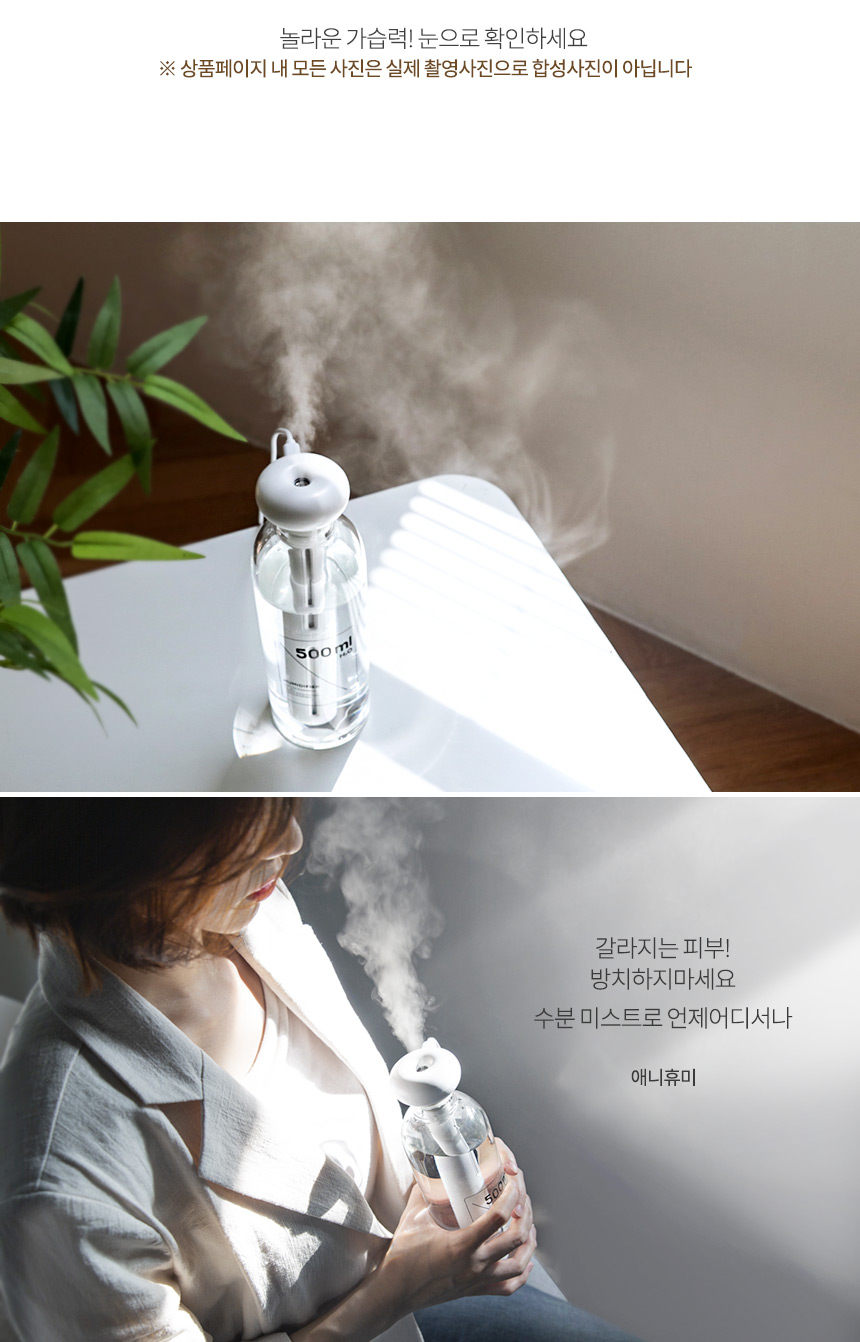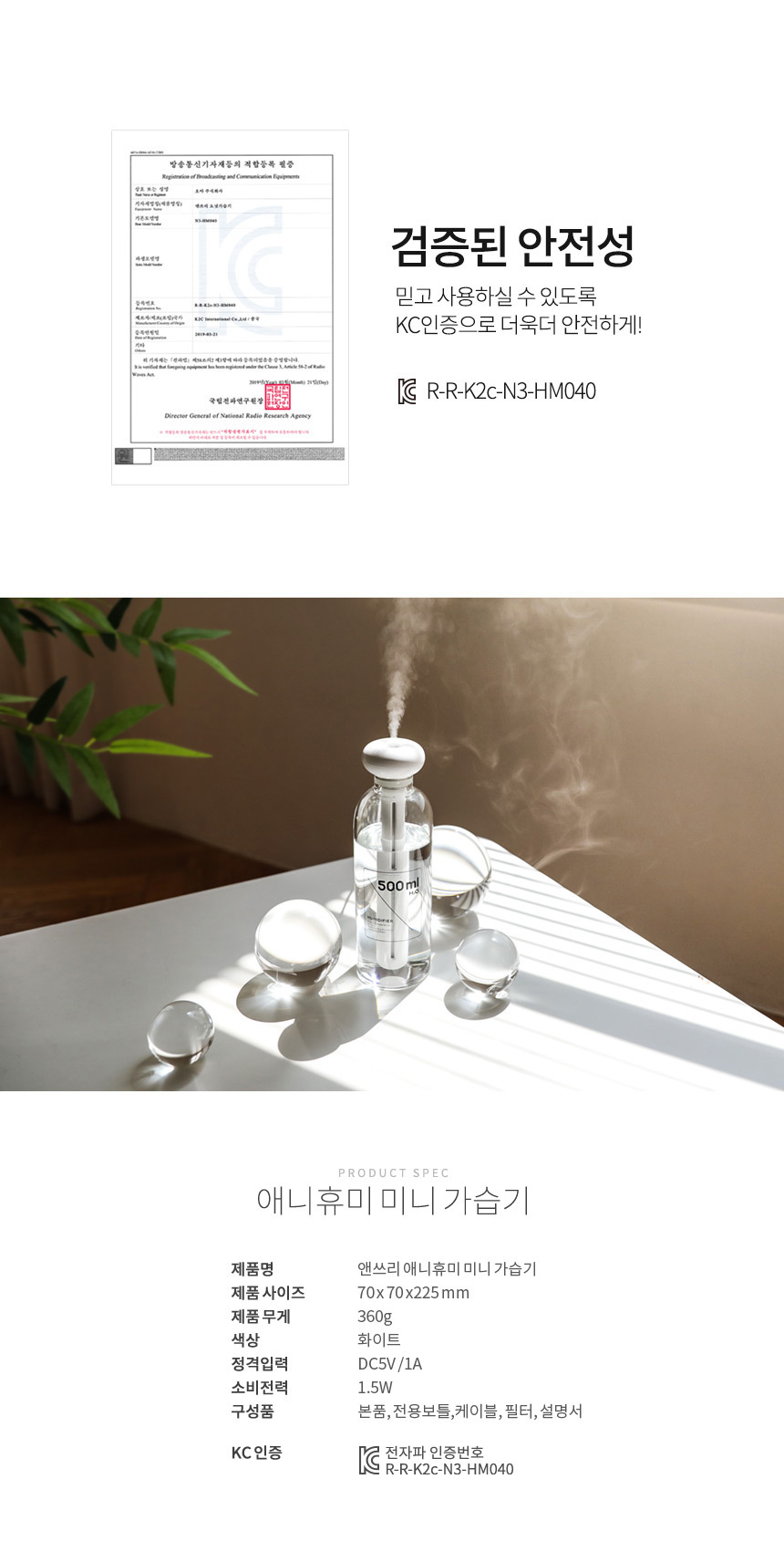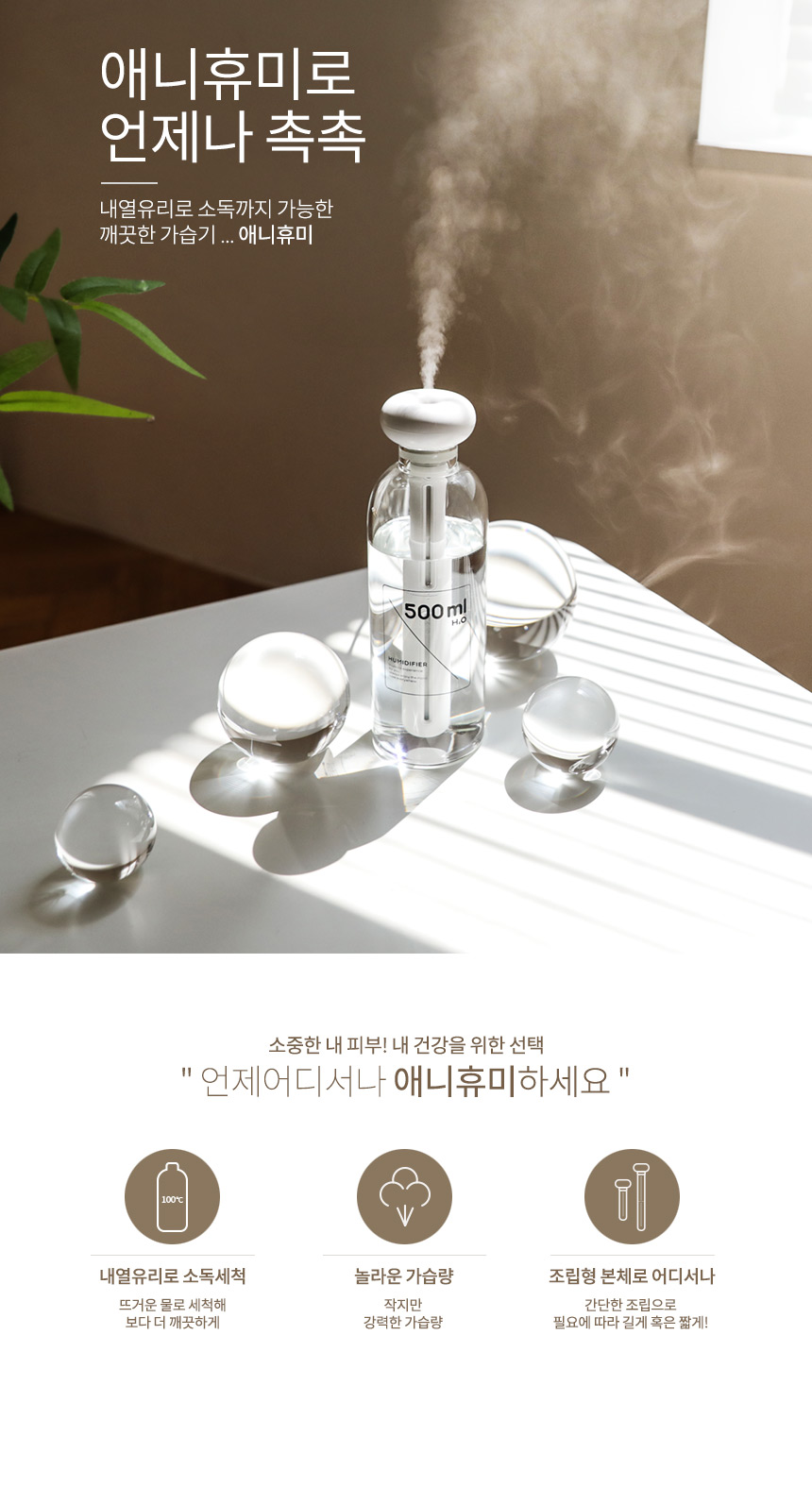 내열유리로 소독까지 가능한 깨끗한 가습기 애니휴미 / 조립형 본체로 어디서나 길게 짧게 사용가능.