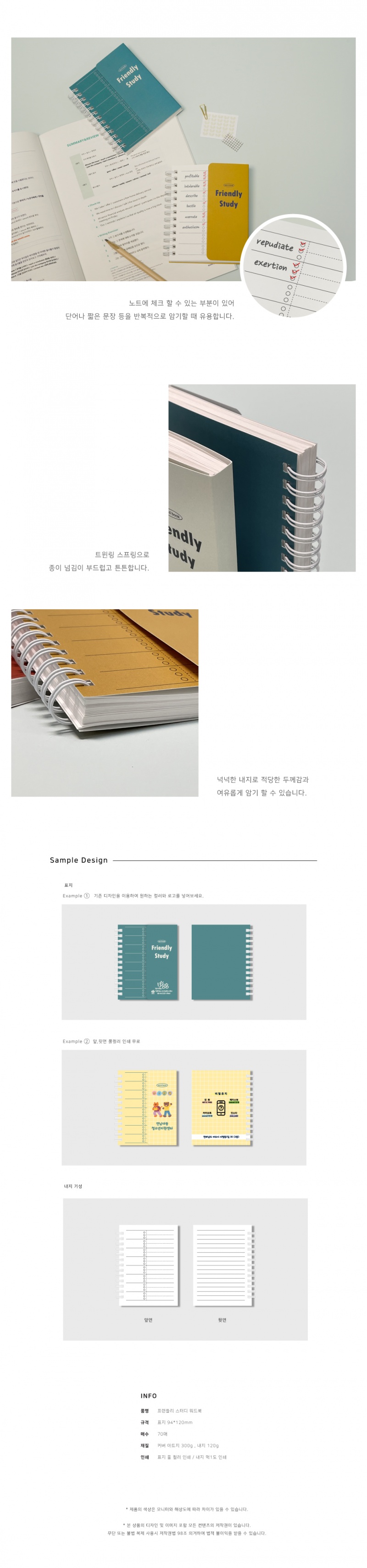앞,뒷표지 칼라인쇄 포함, 내지 70매(천개이상 인쇄가능)