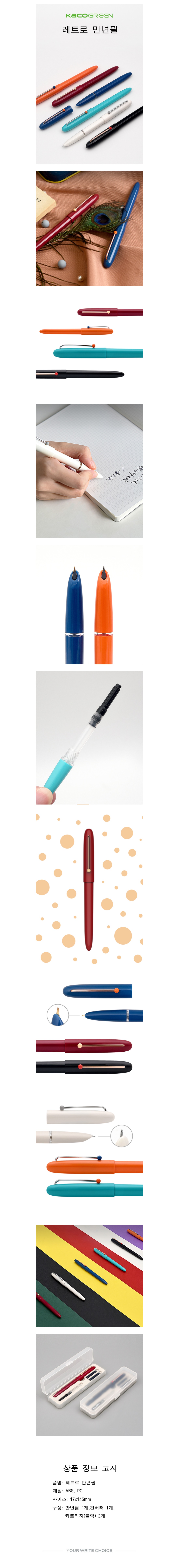 심플하면서 모던하게, 기본을 원칙으로 두는 카코의 만년필 중 '레트로'라는 모델명에 걸맞는 유니크하면서 감성적인 만년필 디자인입니다. 각 펜마다 도트무늬 포인트가 있어 작은 재미를 더해주며 어디든 자연스럽게 매칭이 가능합니다.