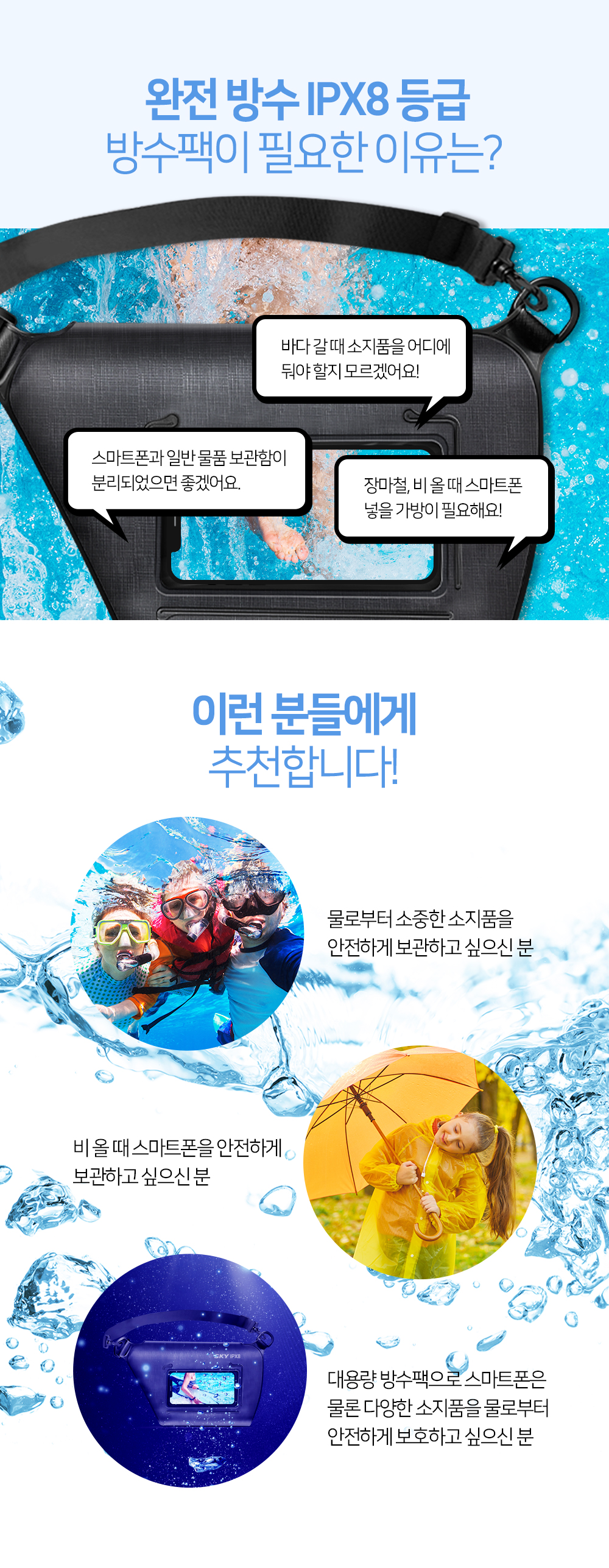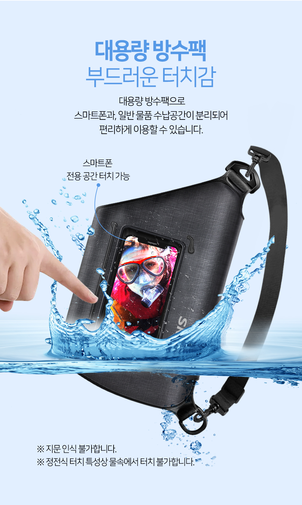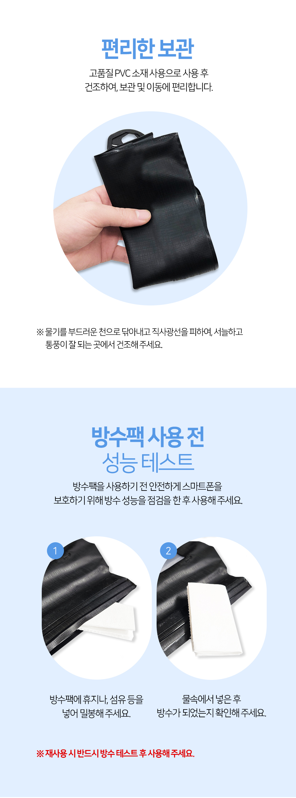 IPX8 등급의 완벽방수로 물속에서 걱정 없이 사용 가능 / 스마트폰, 물품 수납공간이 분리되어 편리하게 사용 가능