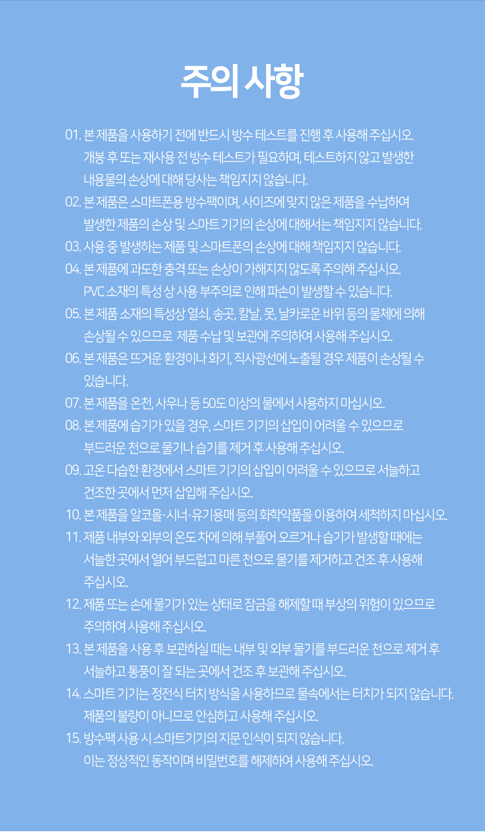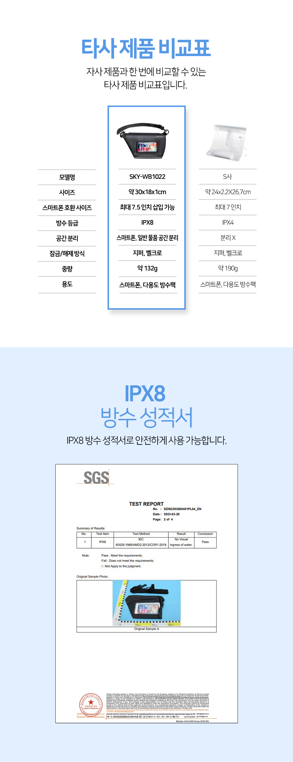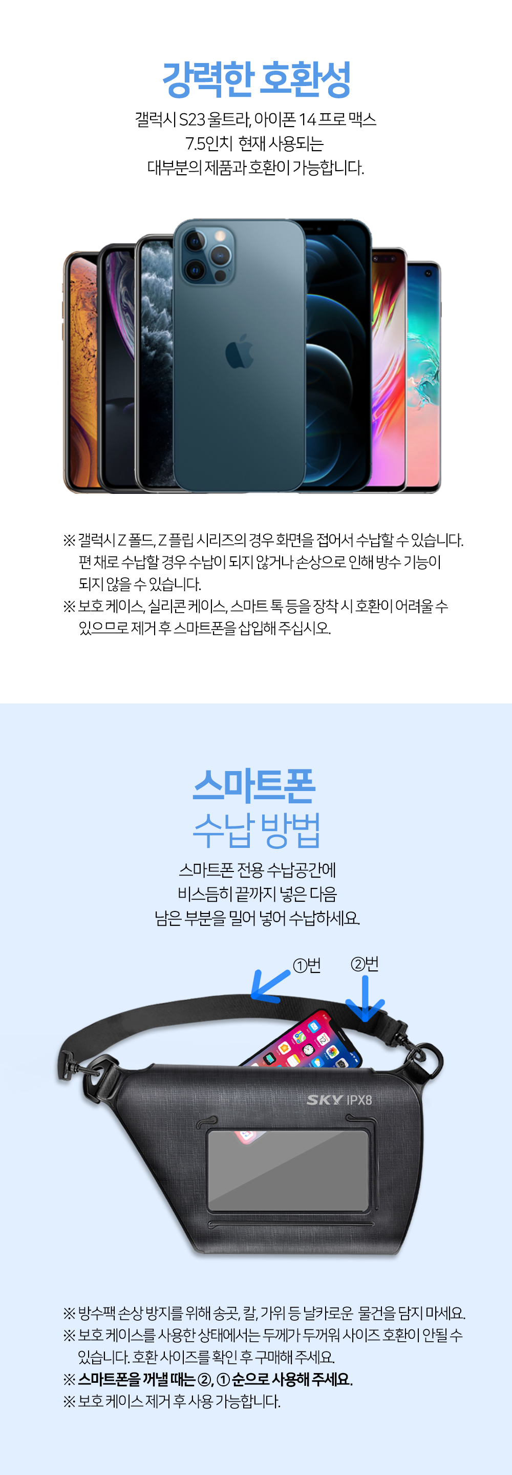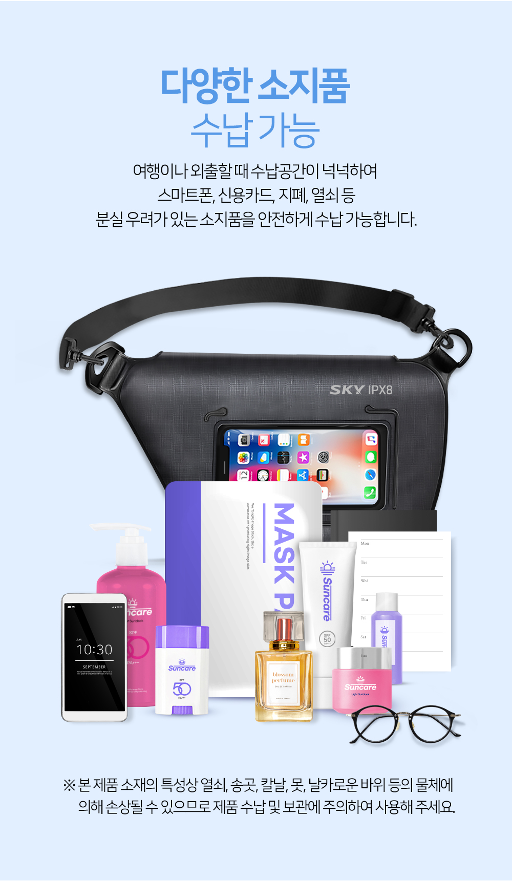 IPX8 등급의 완벽방수로 물속에서 걱정 없이 사용 가능 / 스마트폰, 물품 수납공간이 분리되어 편리하게 사용 가능