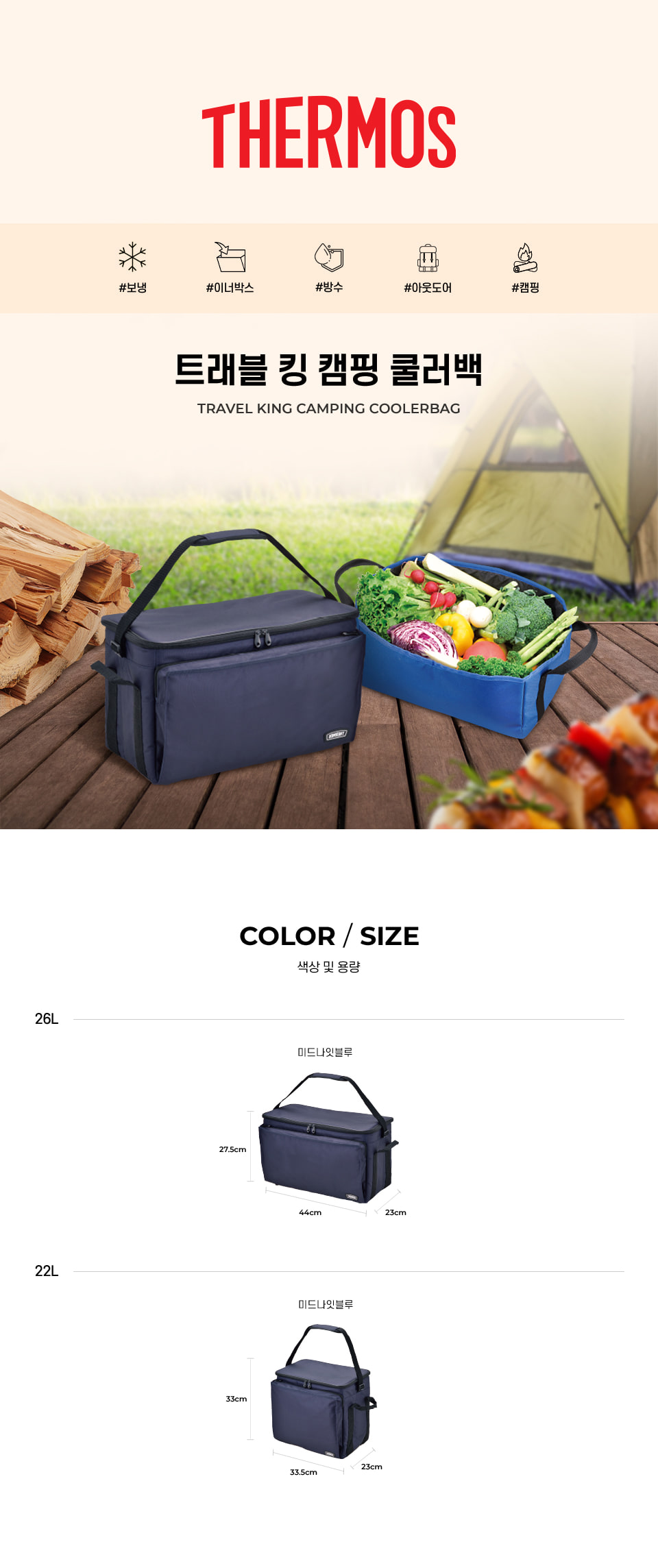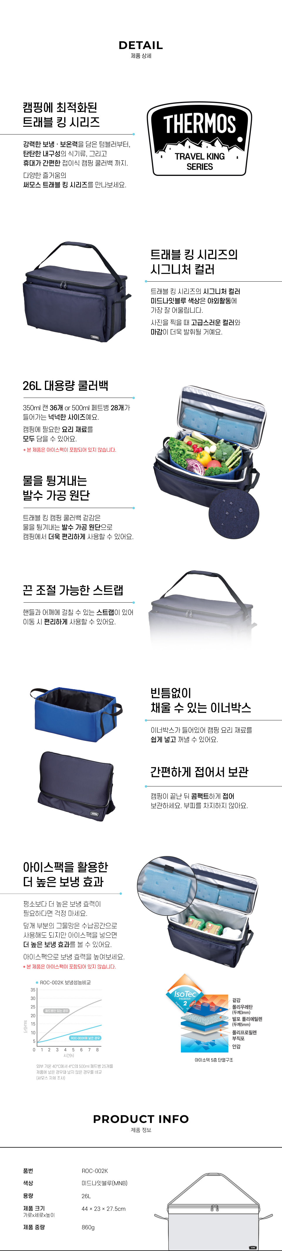 26L의 넉넉한 용량 / 우수한 보냉 효력 / PEVA 안감, 생활방수 겉감사용 / 스트랩 & 카트밴드 / 실용성을 더한 디테일한 디자인 / 접어서 간편하게 보관