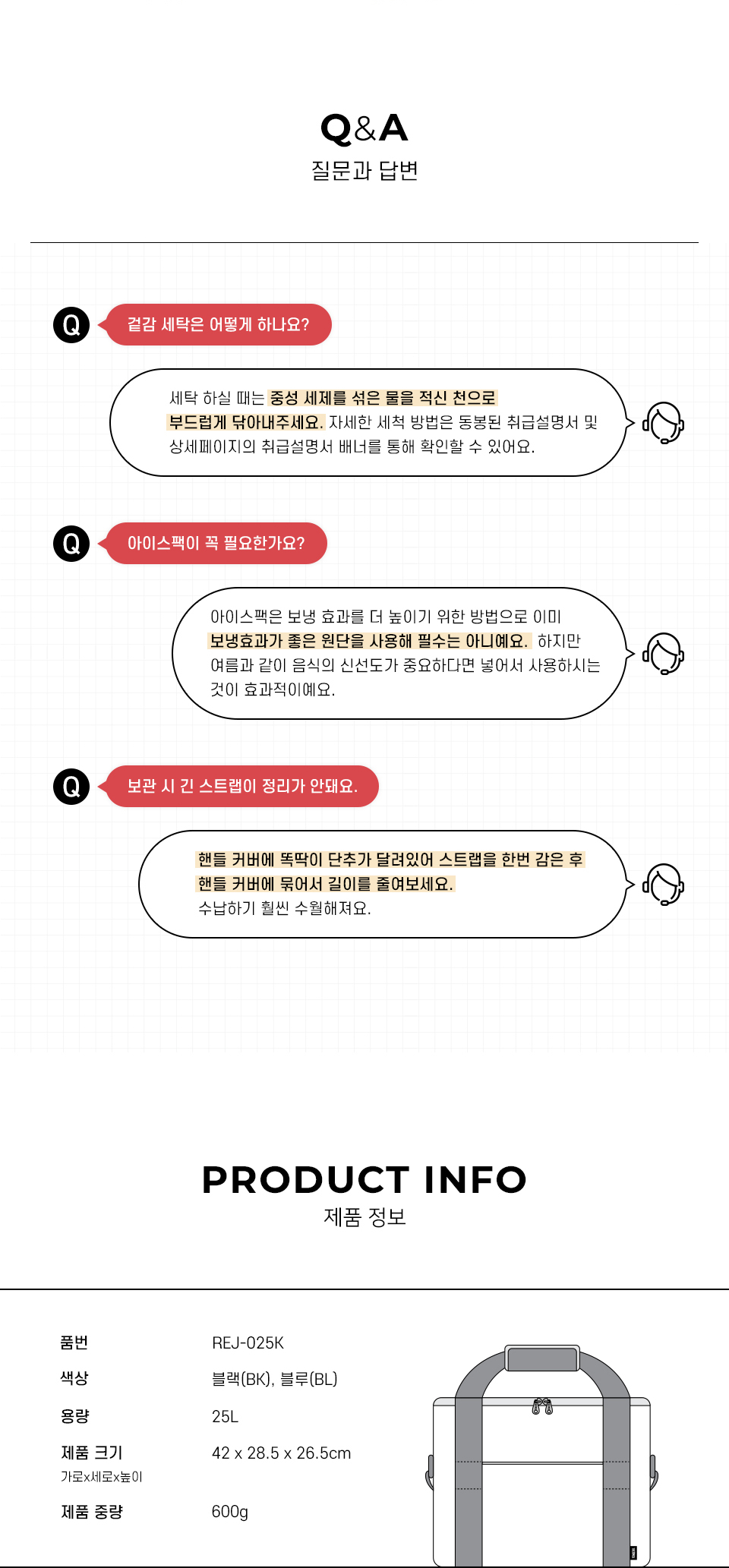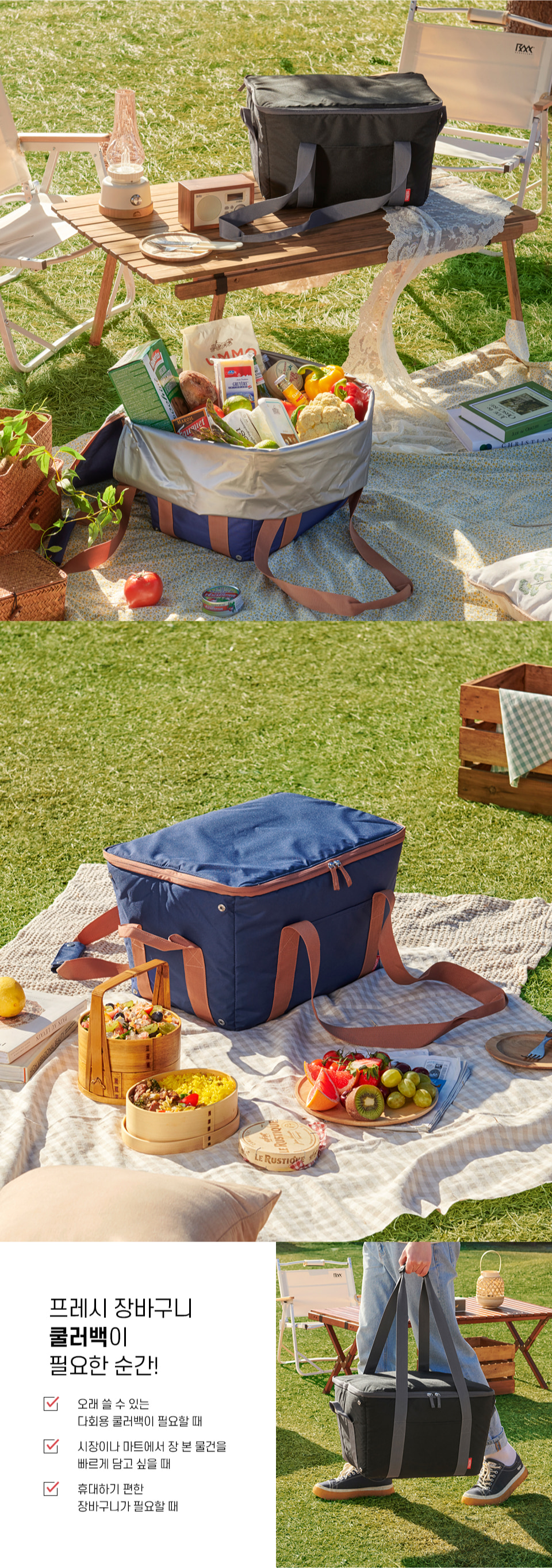 넉넉한 사이즈 / 버켓 형태의 넓은 입구 / 단단한 바닥 받침 / 우수한 보냉 효력 / PEVA 안감 소재 사용 / 실용성을 더한 디테일