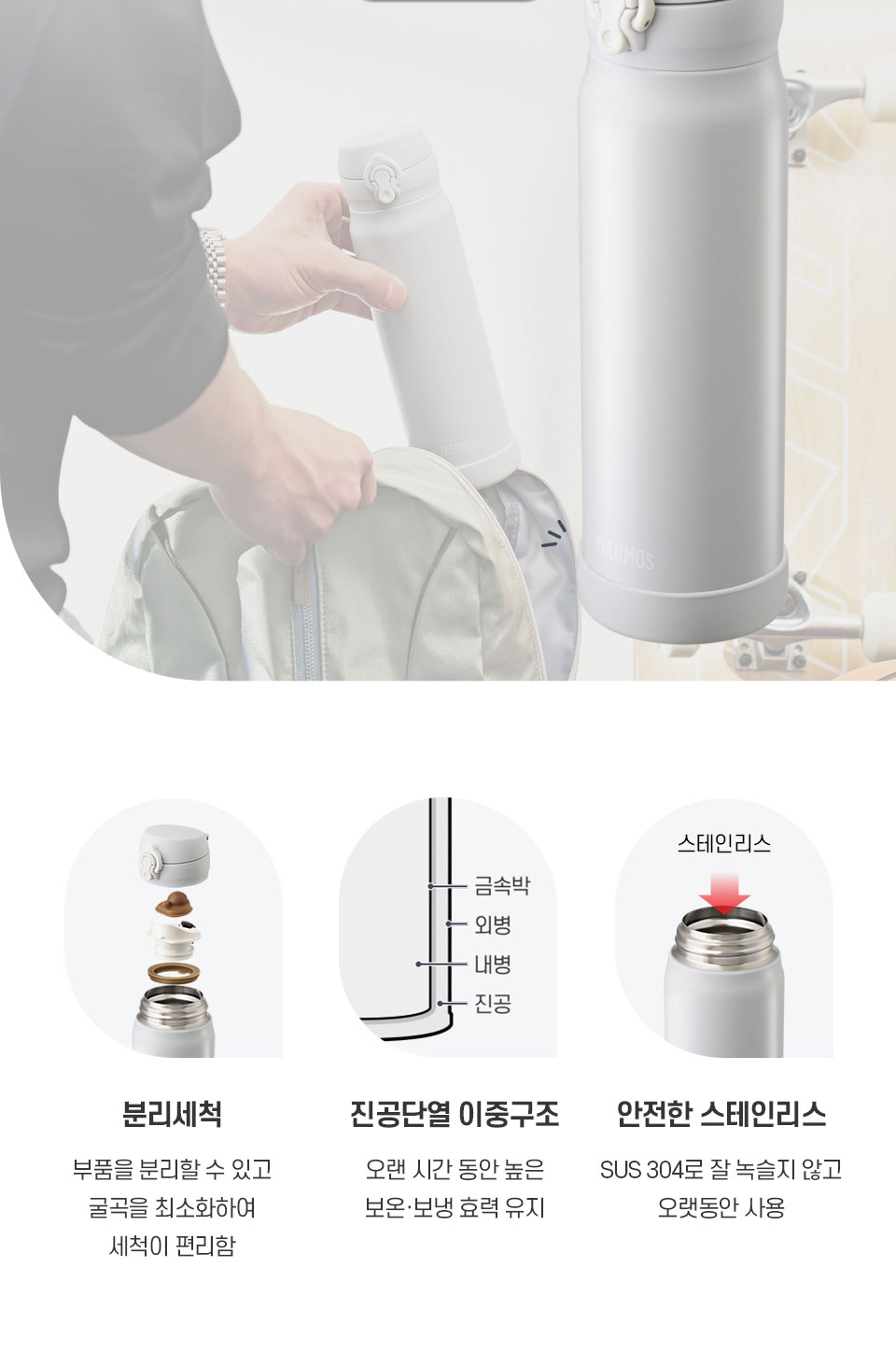 흔들림 없는 마개 고정 / 이중 안전 잠금장치 / 진공단열 스테인리스 이중구조 / 안전한 스테인리스 재질
