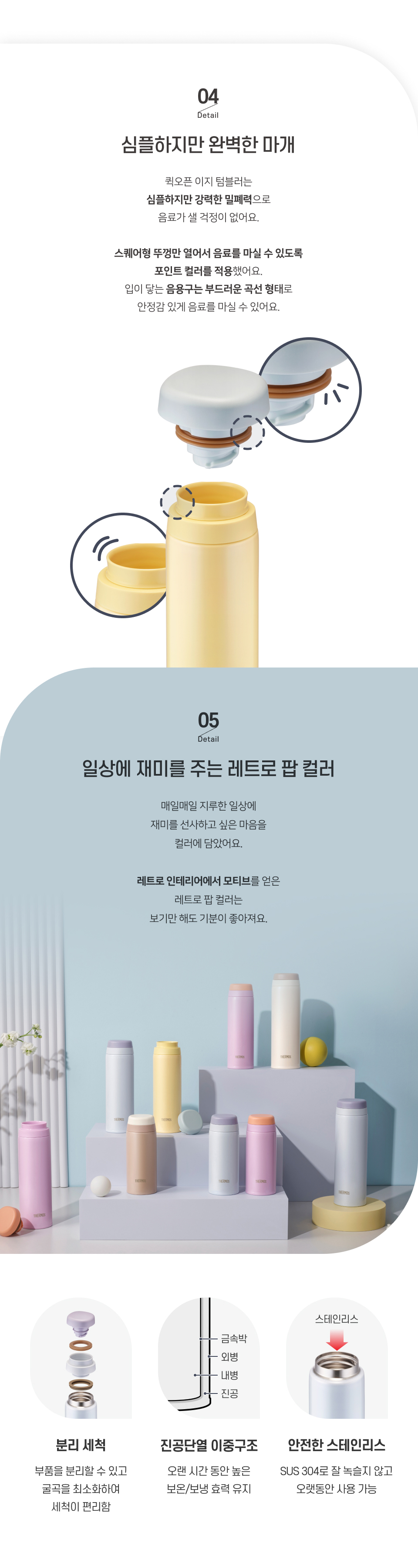 심플하지만 완벽한 마개로 손쉽게 여닫는 이지 뚜껑 / 물 샐 걱정 없는 밀폐구조 / 매일매일 언제 어디서나 안심하고 사용