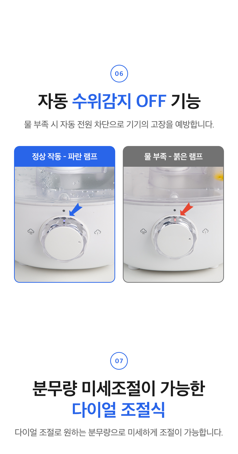 자동 수위감지 센서로 자동 OFF기능(정상작동-파란램프/물부족-붉은램프)