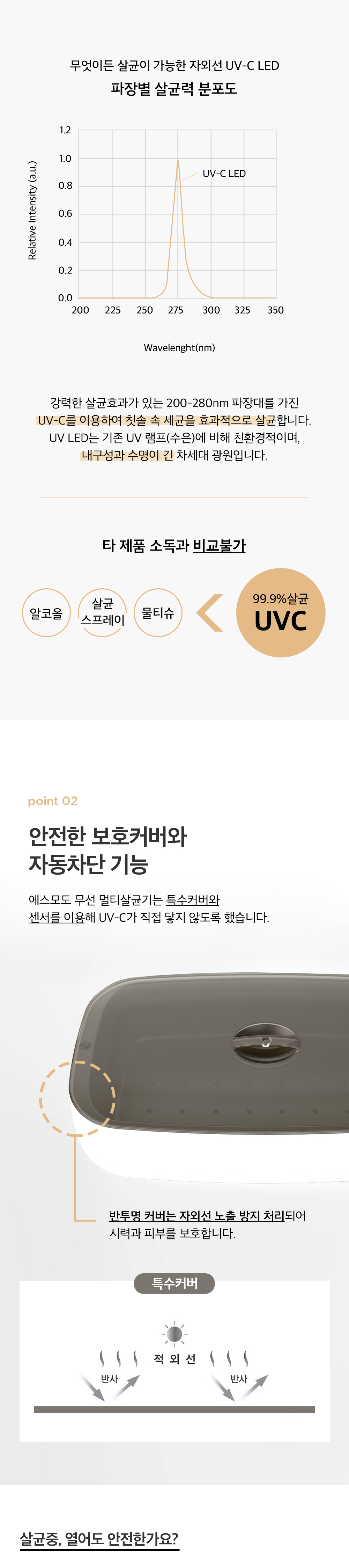 특수커버와 센서를 이용해 UV-C가 직접 닿지 않도록 자동차단 기능 탑재 (재작동시 "ON"버튼)