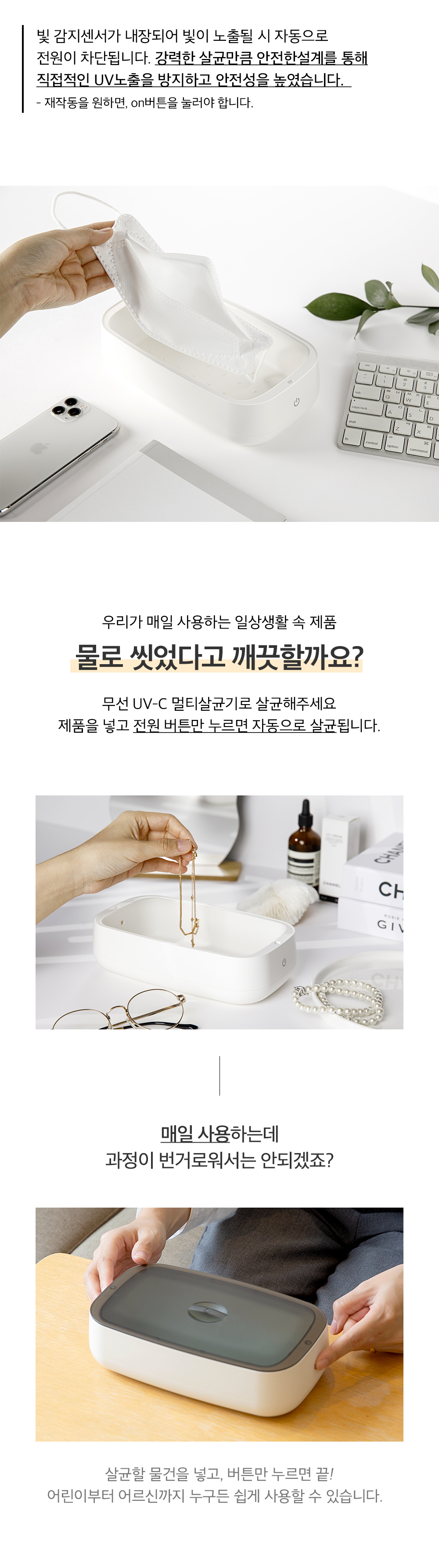 내장 배터리(1000mAh)로 충전 사용 하는 휴대용 유무선 멀티 살균기 / 커버를 간단한 전원버튼으로 살균 소독 가능