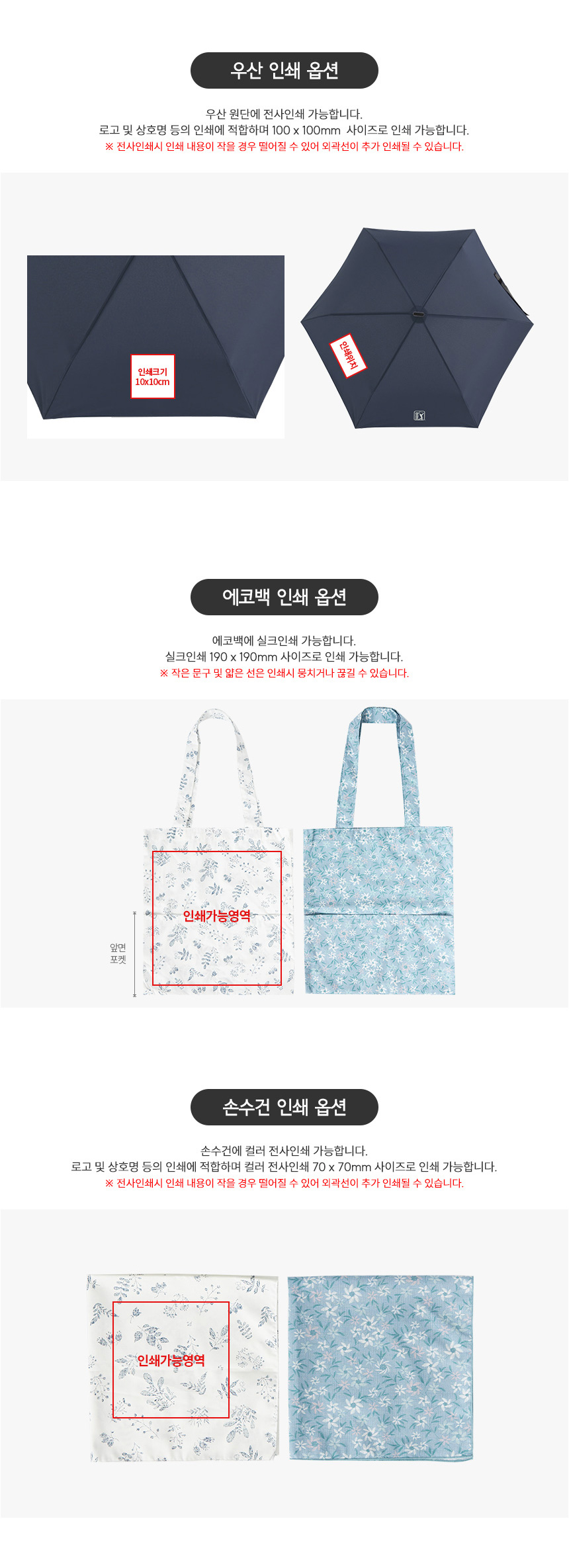 우산원단인쇄: 1도인쇄 550원 / 컬러인쇄(10*10cm 기준) 1,600원 / 100개 미만시 55,000원