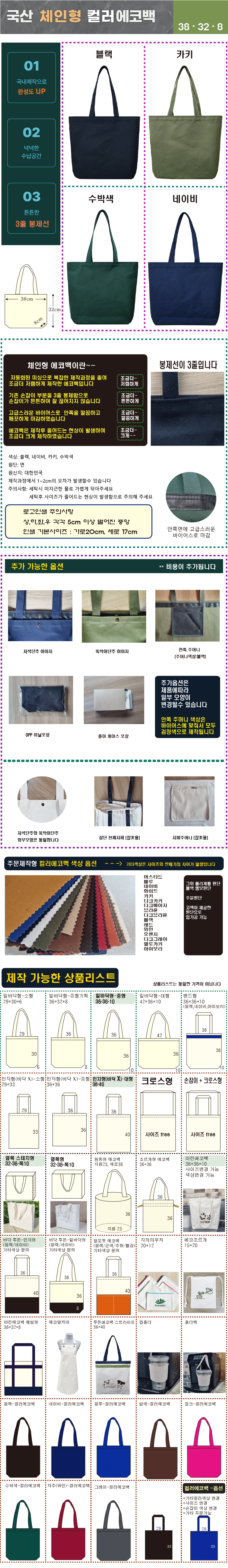 국산 체인형 컬러 에코백 380*320*80