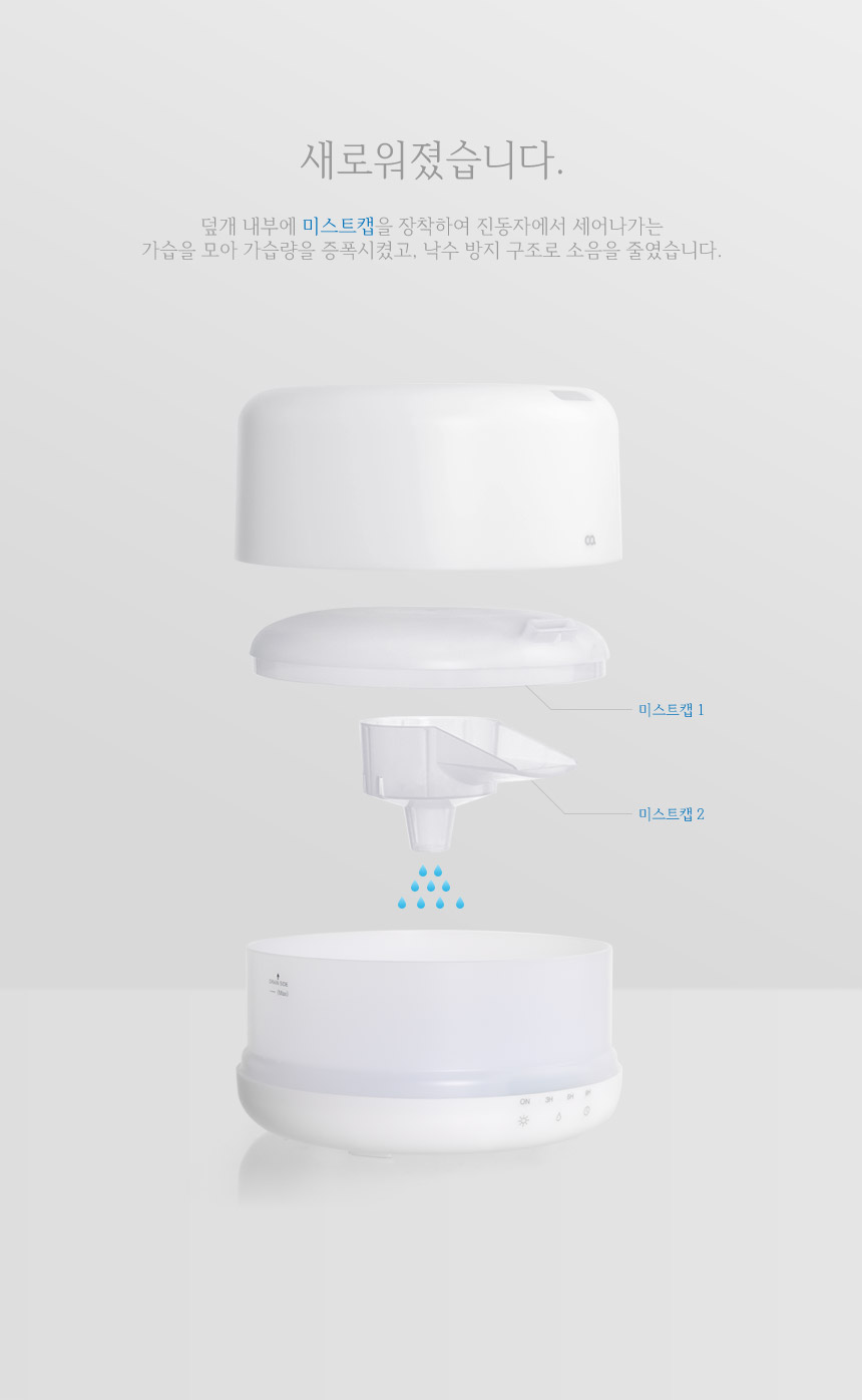 가열에 의한 온도변화로 오일 본연의 향에대한 손실없이 초음파에 의한 진동으로 물과 에센셜 오일을 미스트로 만들어 풍부한 향을 확산시켜 줍니다
