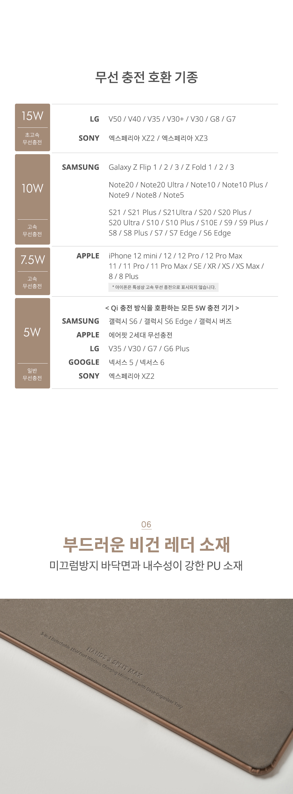 5가지 스마트IC : 과전압 방지, 과전류 방지, 과열보호 방지,충전시 이물질 자동감지,다양한 입력 파워지원