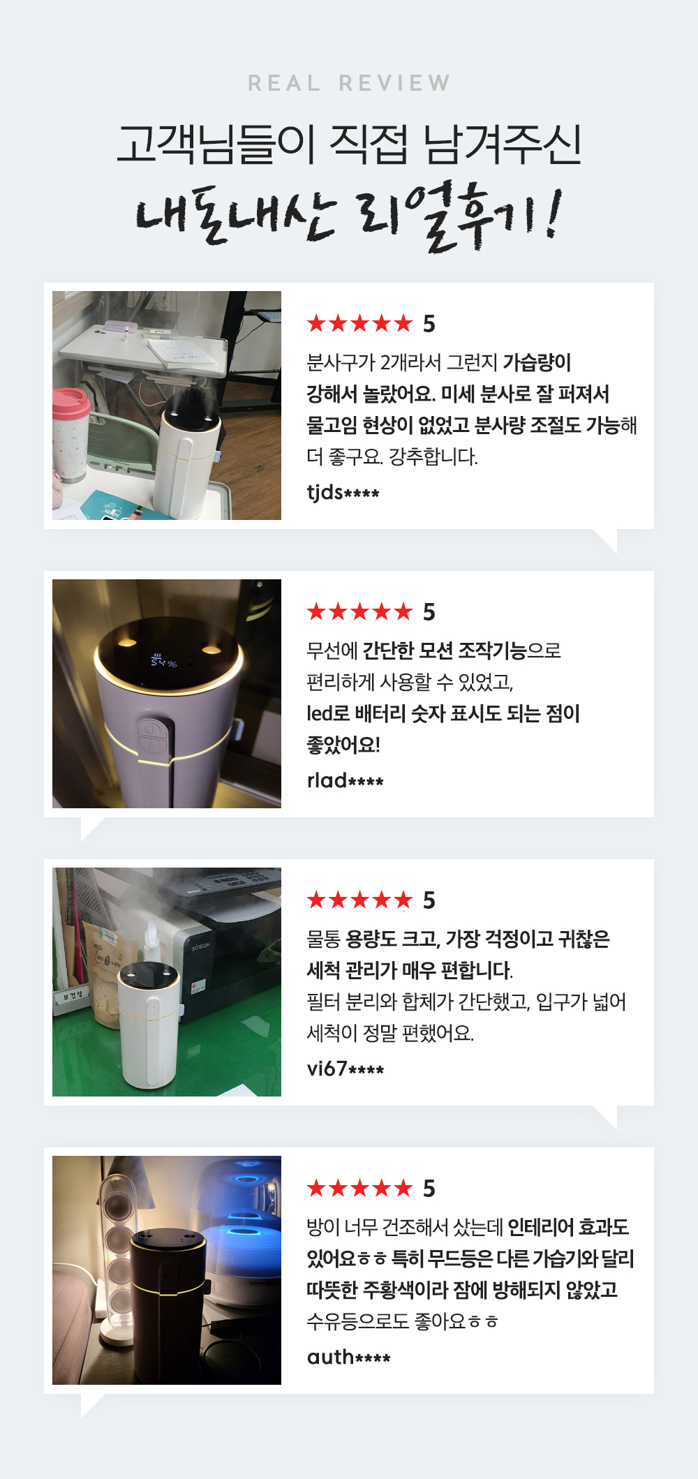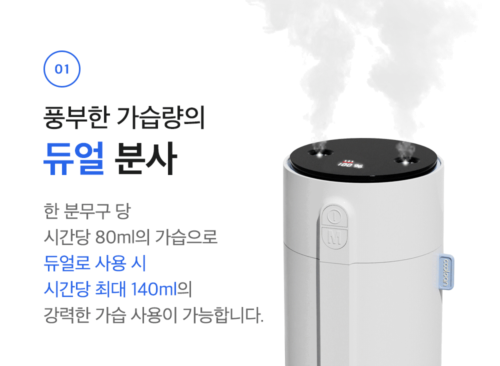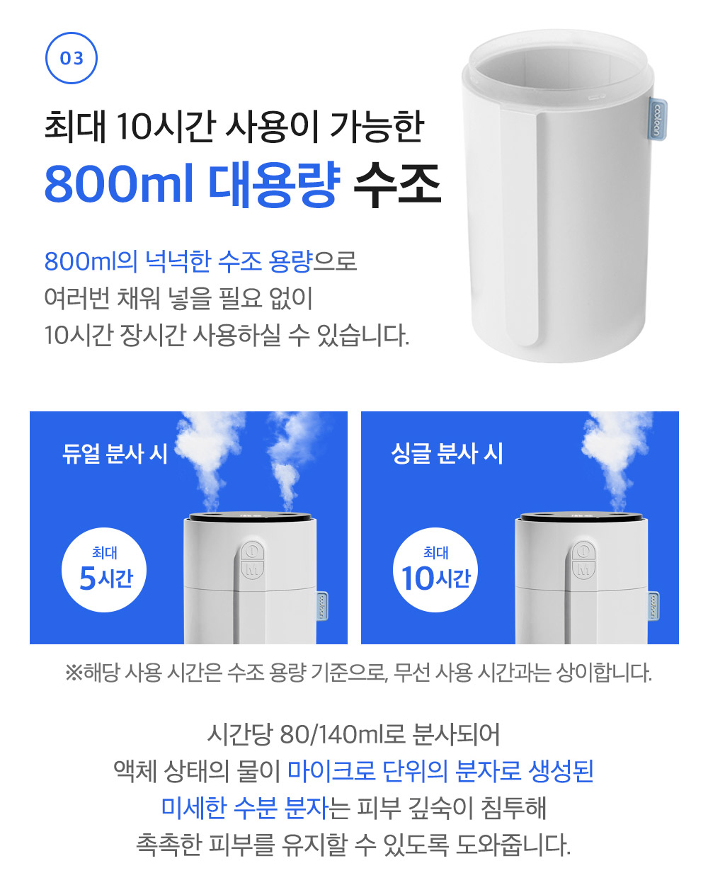 사용시간 : 연속 가습 시 약 3.5시간, 간헐적 가습 시 약 7시간(완충시)