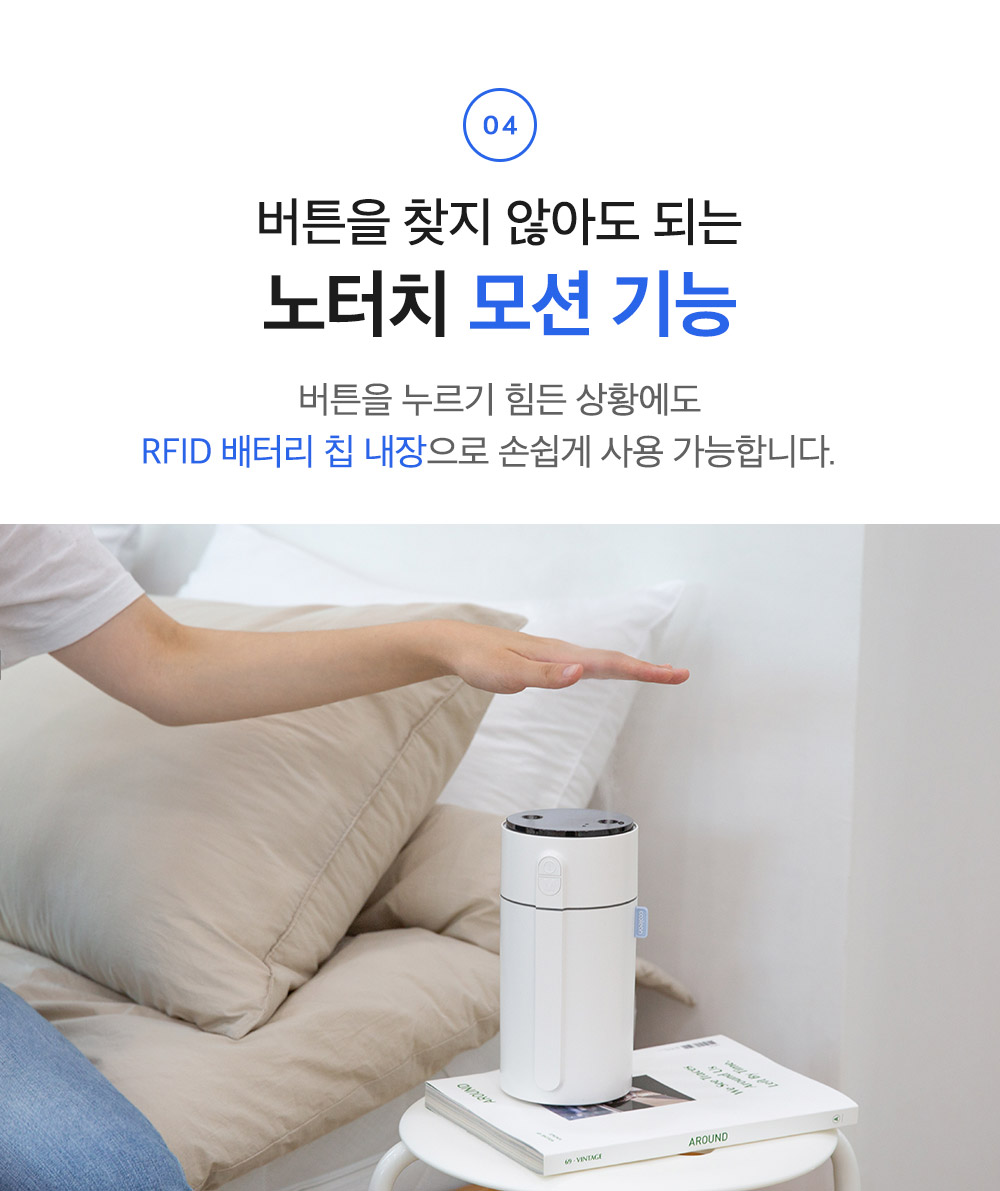 노터치 모션 기능 : 버튼을 찾아 누르기 힘든 상황에도 [RFID] 칩 내장으로 손쉽게 사용 가능 / 최대 10시간 가습(800ml)