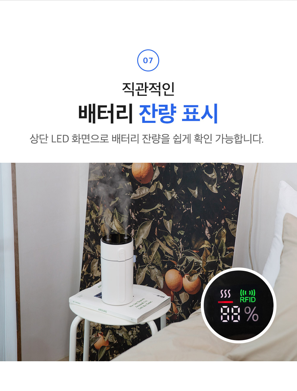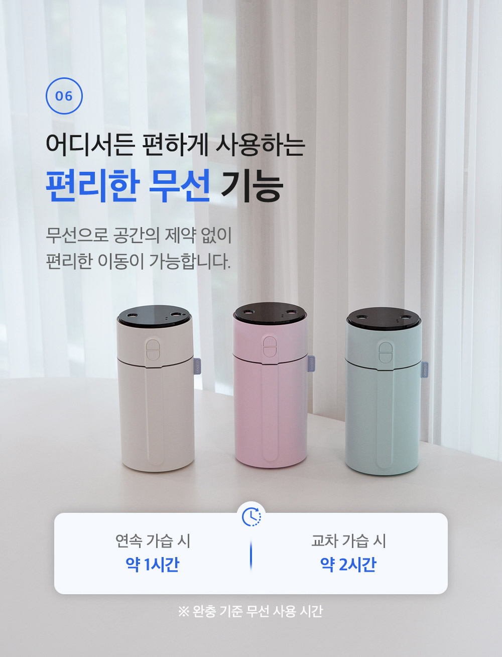무드등 기능 / 분무량 : 최대 140ml/h / 2,000mah 대용량 배터리, 배터리 잔량 표기(무선가습기)