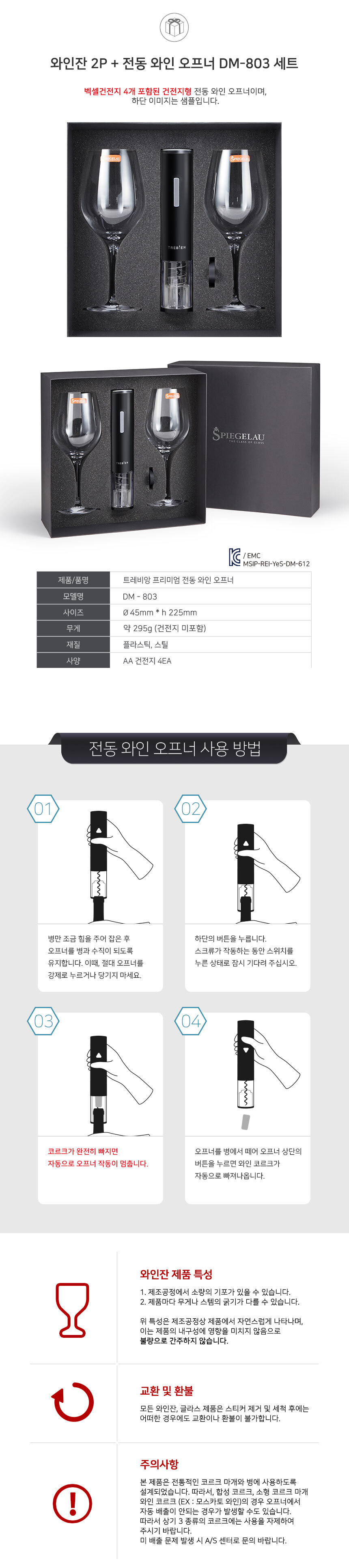 구성 : 슈피겔라우 비노비노 보르도 와인잔 2P+트레비앙 전동 와인오프너 (DM-803)+호일커터+오프너 보관용 더스트백+한글설명서+고급 선물상자 (오프너 건전지 포함)