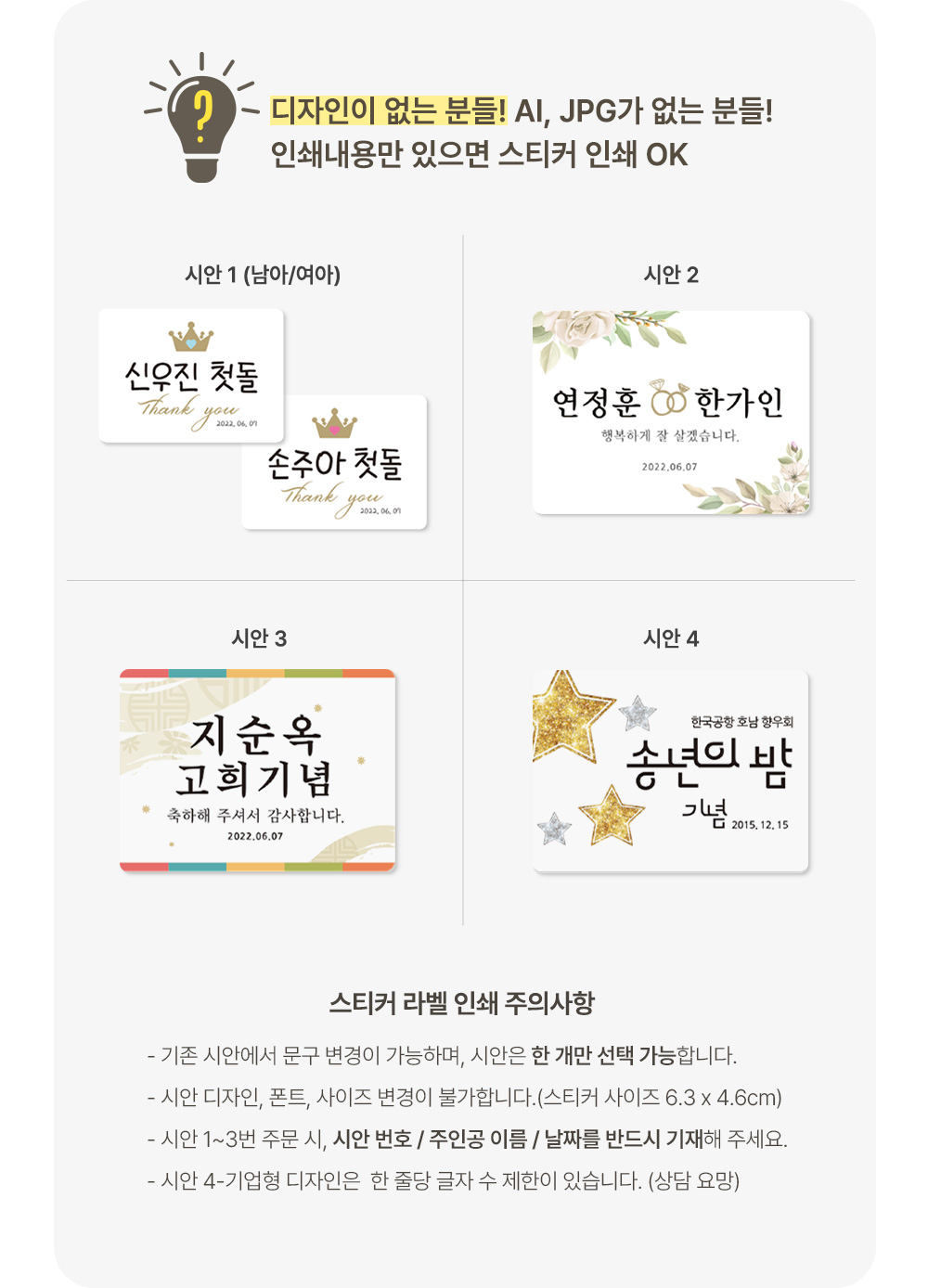 • 최종 시안을 컨펌 받은 후에는 오타나 인쇄 문구의 착오에 대한 모든 책임은 고객에게 있으므로 인쇄시안 꼭 철저하게 확인해 주시기 바랍니다.