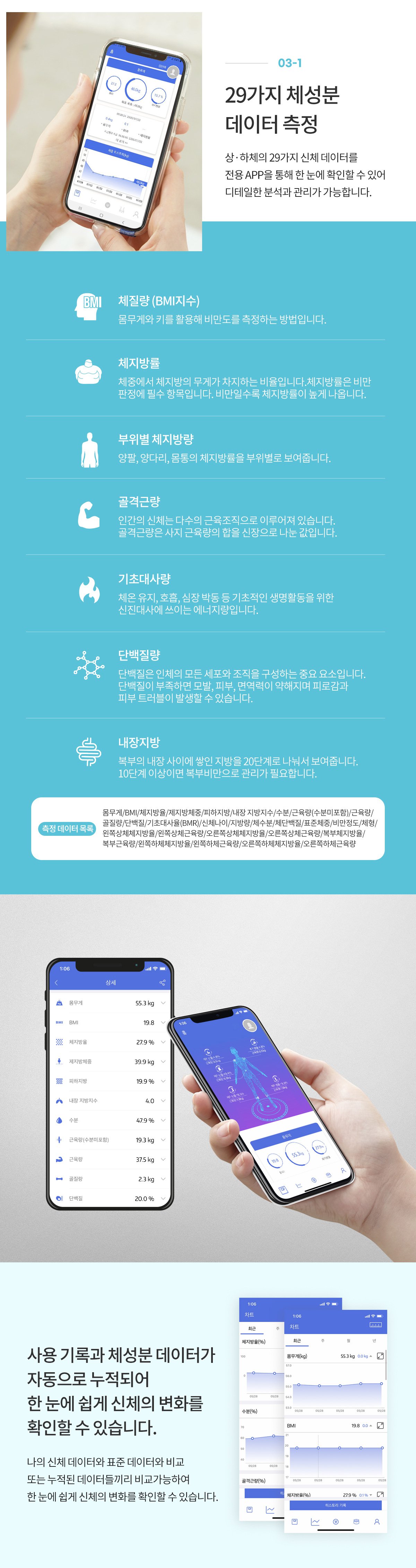 한번의 측정으로 총 29가지의 신체정보를 분석하는 스마트 체중계 입니다.