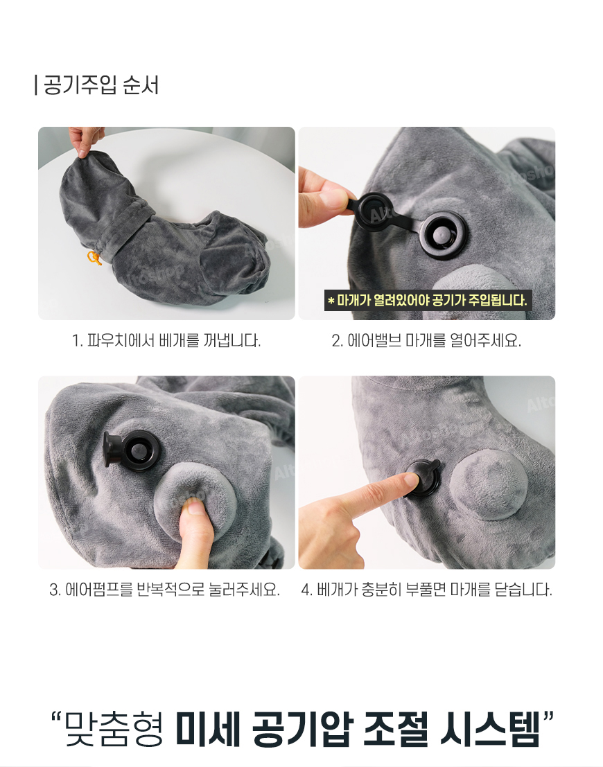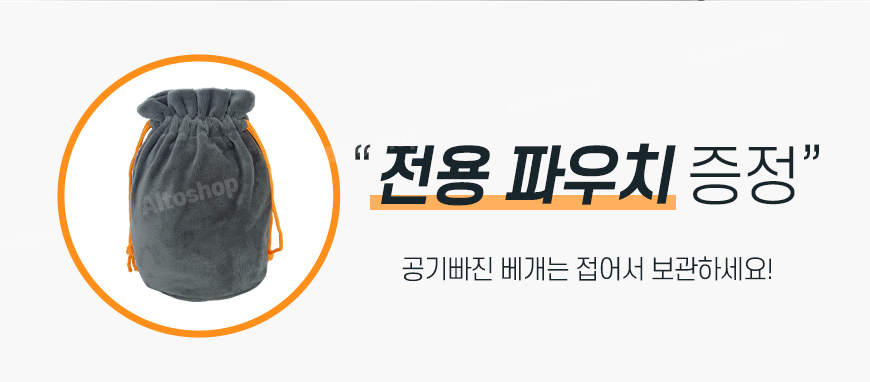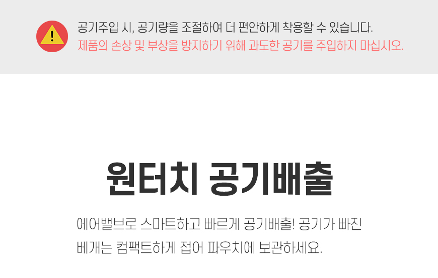 에어펌프 공기주입 방식 / 원터치 공기배출 가능 / 겉감을 분리하여 손세탁이 가능 / 파우치가 있어 휴대가 편리