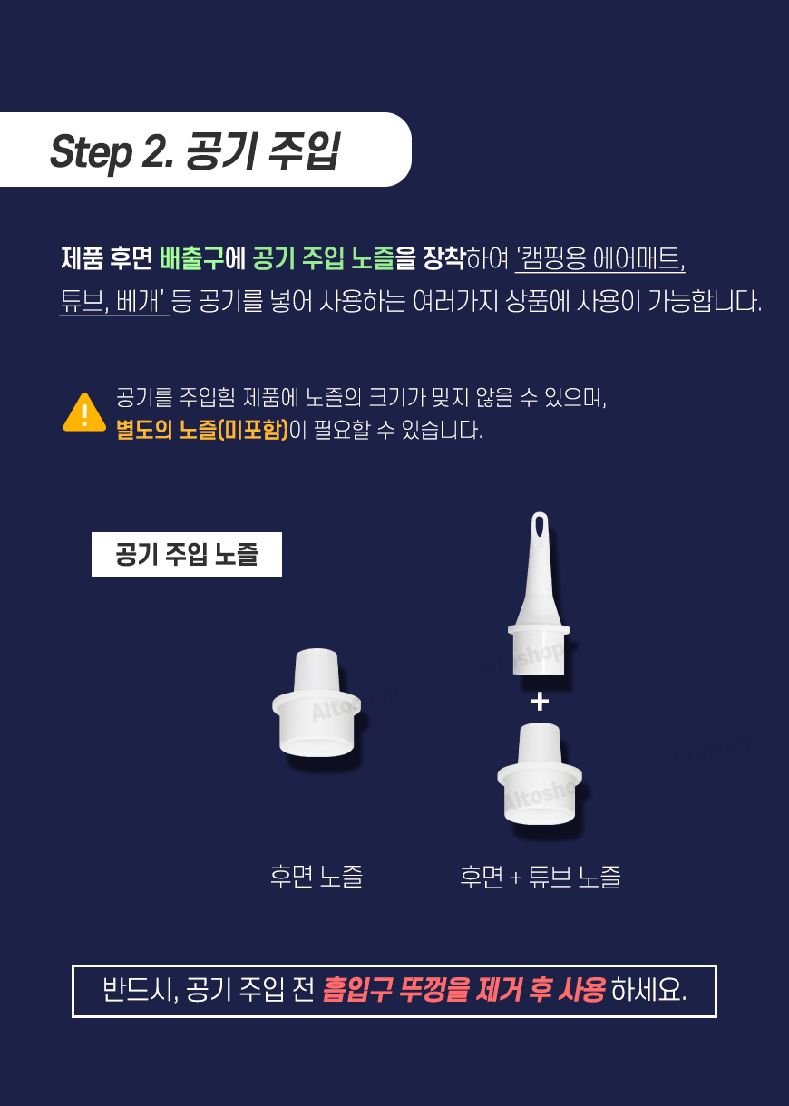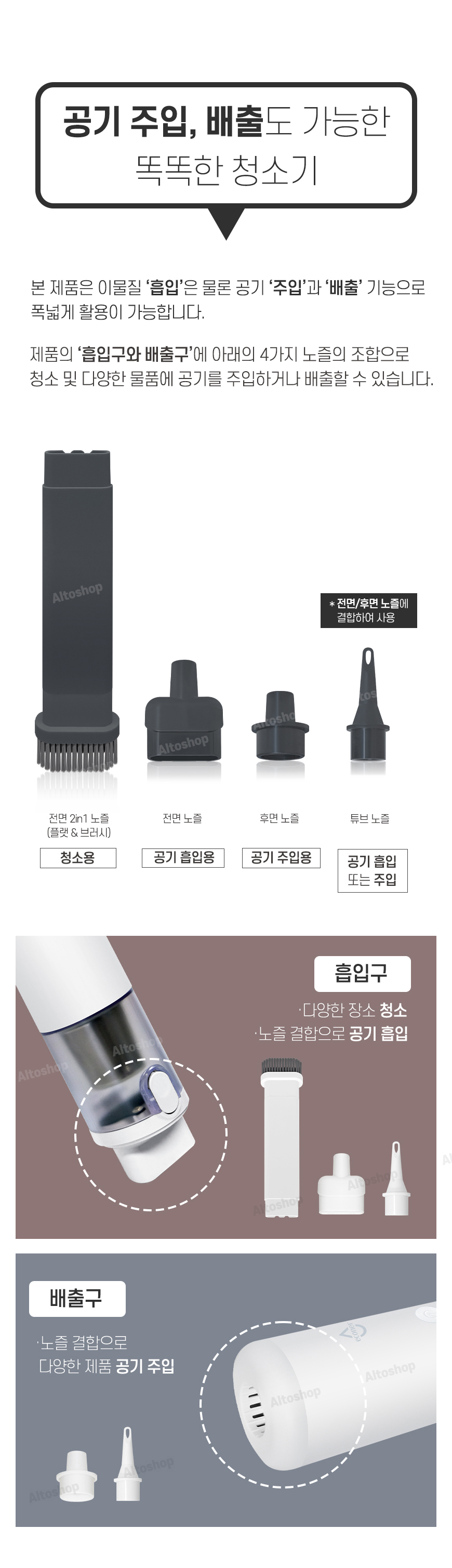 구성품: 본품, C타입케이블, 설명서, 보관파우치, 슈레더 에어호스, 호스보호캡, 프레스타노즐, 튜브노즐, 에어베드노즐, 공노즐
