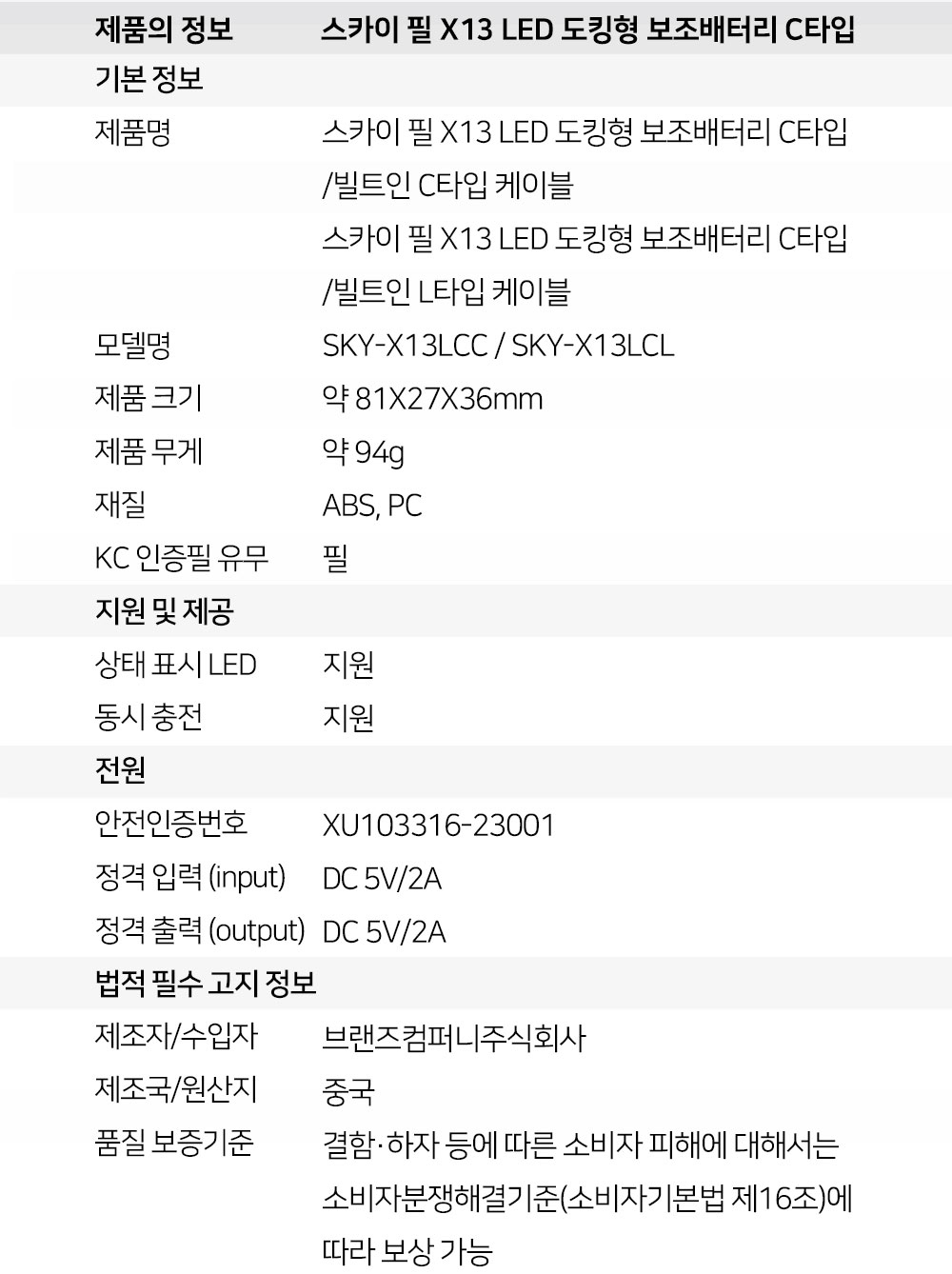 상품 이미지: 스카이 필 X13 LED 도킹형 보조배터리 5000mAh