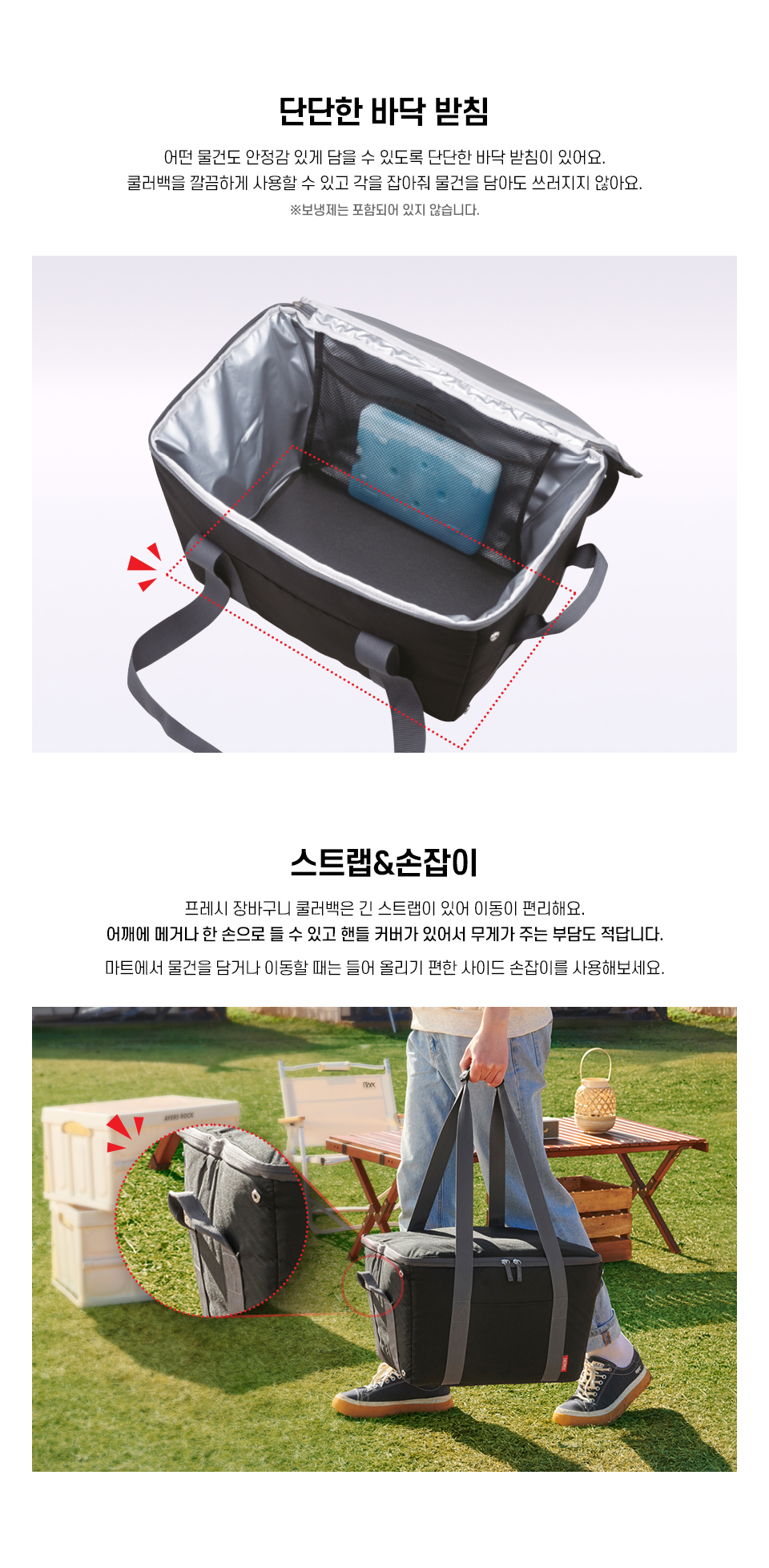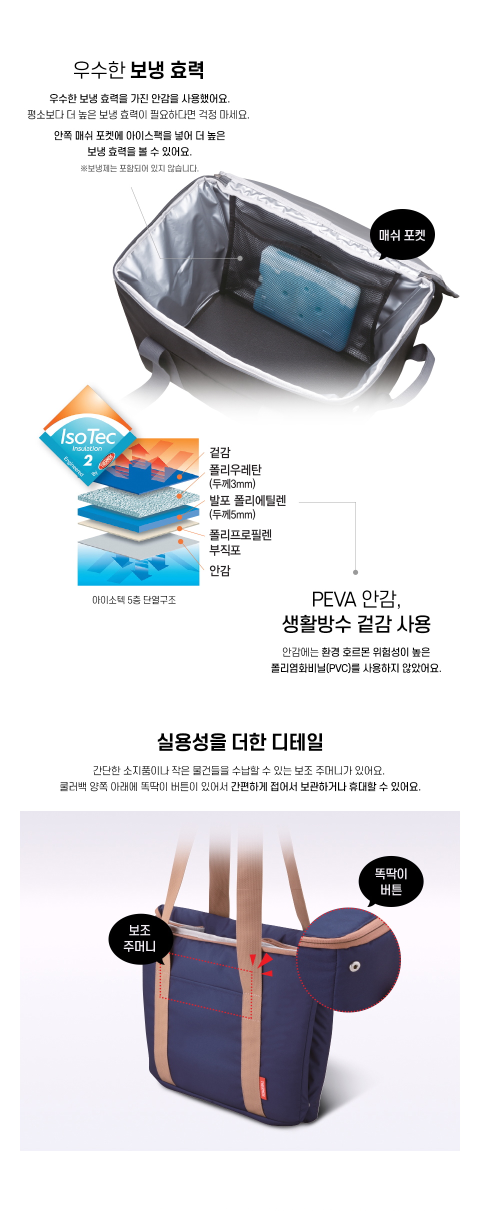 넉넉한 사이즈 / 버켓 형태의 넓은 입구 / 단단한 바닥 받침 / 우수한 보냉 효력 / PEVA 안감 소재 사용 / 실용성을 더한 디테일