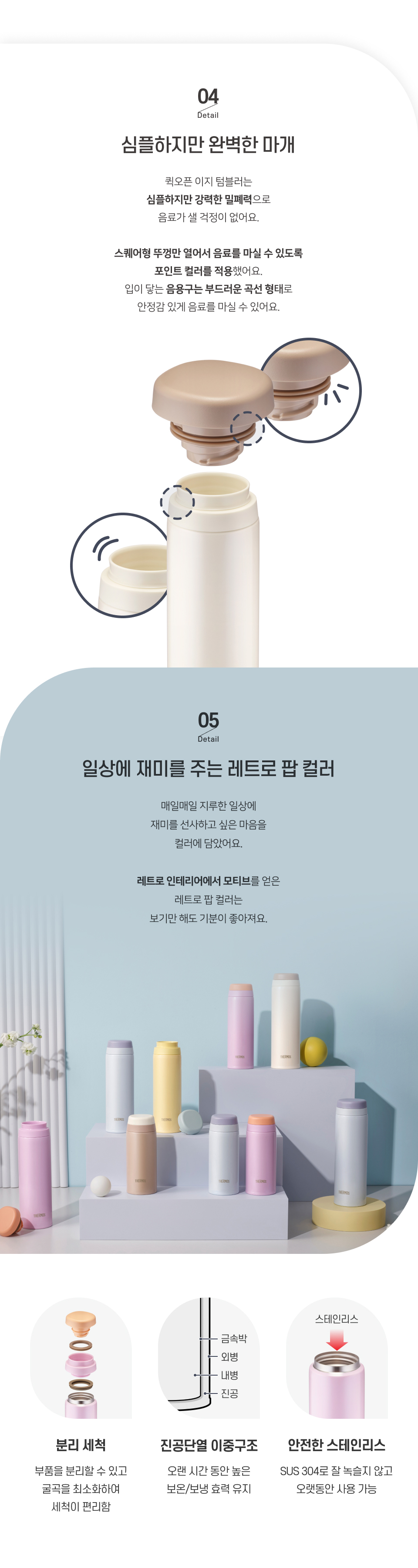 심플하지만 완벽한 마개로 손쉽게 여닫는 이지 뚜껑 / 물 샐 걱정 없는 밀폐구조 / 매일매일 언제 어디서나 안심하고 사용