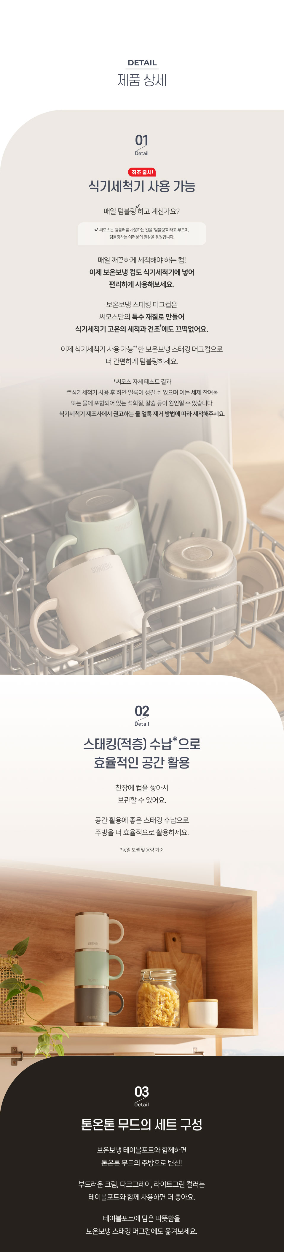 스태킹(적층) 수납 가능(컵을 쌓아 올릴 수 있어 주방 공간을 효과적으로 활용) / 톤온톤 무드의 세트구성