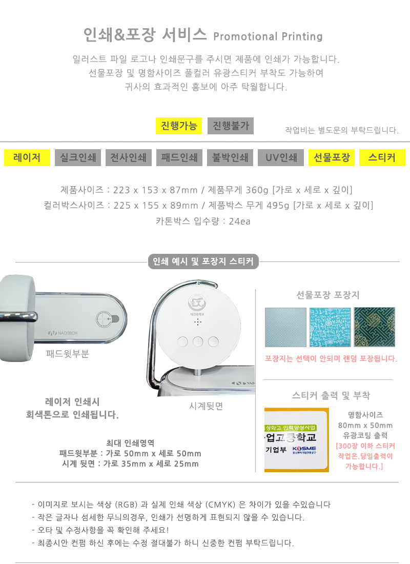 인쇄위치 : 충전패드 부분 or 시계 뒷면 / 충전패드부분 : 가로 50mm x 세로 50mm / 시계 뒷면 : 가로 35mm x 세로 25mm / 50개이상 레이저인쇄 개별 400원 / 50개미만 레이저인쇄 통합 20,000원 / 선물포장 400원 [포장지사이즈 : 330 x 240mm] / 카톤당 택배비 4,000원 [입수량 24개] / 유광스티커: a타입 : 가로 60mm x 세로 25mm - 50원 / b타입 : 가로 80mm x 세로 50mm - 100원 / c타입 : 가로 131mm x 세로 92mm - 200원