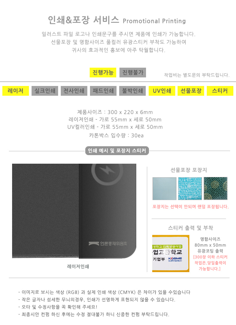 • 배송비는 무료배송을 원칙으로 하나 기본수량이하 제작시 배송비가 추가될 수 있습니다.