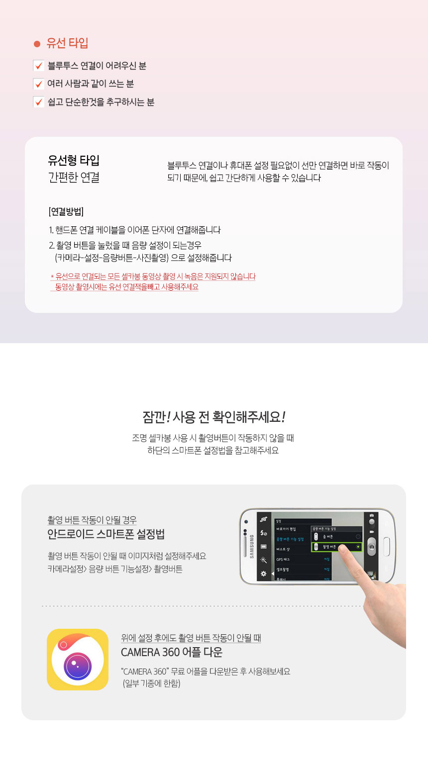 이어폰 단자에 연결하여 사용 / 휴대폰 카메라 설정에서 음량버튼으로 촬영 설정하여 사용